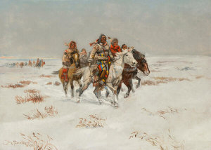 Lacking specific information on the incident portrayed here, it is a fair guess that the “defiant culprit” has been captured on a horse raid and is now about to pay the price of his audacity. Clothing and hair styles suggest that a Sioux warrior is facing his Blackfoot captors. Russell has underlined the melodramatic nature of the moment by throwing the tipi into deep shadow allowing the flickering firelight to play over the stern features of the culprit’s judges and the stooped figure of the old woman. The long arm of the law literally rests on the culprit’s shoulder while he stands with his blanket dropped at his feet vulnerable in his nakedness but arrogant in his pride. “It’s their religion to die without a whimper,” Russell wrote in one of his American Indian stories.