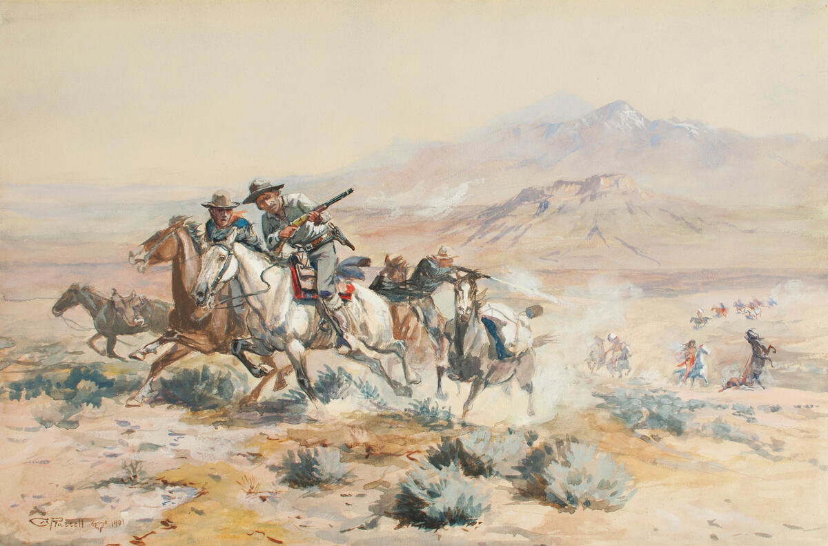 In 1889 Frederic Remington painted a mammoth oil titled A Dash for the Timber showing a band of cowboys racing pell-mell for safety with Apaches hot on their heels. The painting is a dazzling exercise in Wild West theatrics and Remington drove home the point by having all the onrushing cowboys part around the viewer except for one who, coming hell bent for leather, is shown straight on. Russell occasionally painted similar groups of trappers or cowboys in full flight from pursuing warriors, the action sweeping across the picture at an angle, usually from right to left. On the Attack is a carefully painted and vigorous version; its riderless horses and desperate faces tell a dramatic tale. But none of Russell’s paintings on the theme remotely rivals A Dash for the Timber. Suffice it to say, Remington owned the subject.